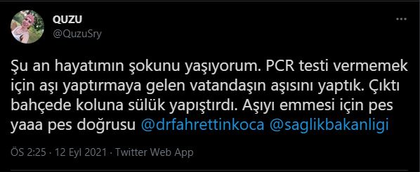 PCR testinden kurtulmak isteyen bir vatandaş, aşı yaptırmaya karar veriyor ve olayı anlatan hemşirenin çalıştığı hastanede aşısını yaptırıyor. Aşı yaptıran vatandaş, hastaneden çıkar çıkmaz koluna sülük yapıştırıyor. Evet yanlış duymadınız sülük. Sülüğün kan emici özelliği ile vücudundaki aşıyı çıkarmak isteyen vatandaş koluna bir sülük yapıştırıyor.