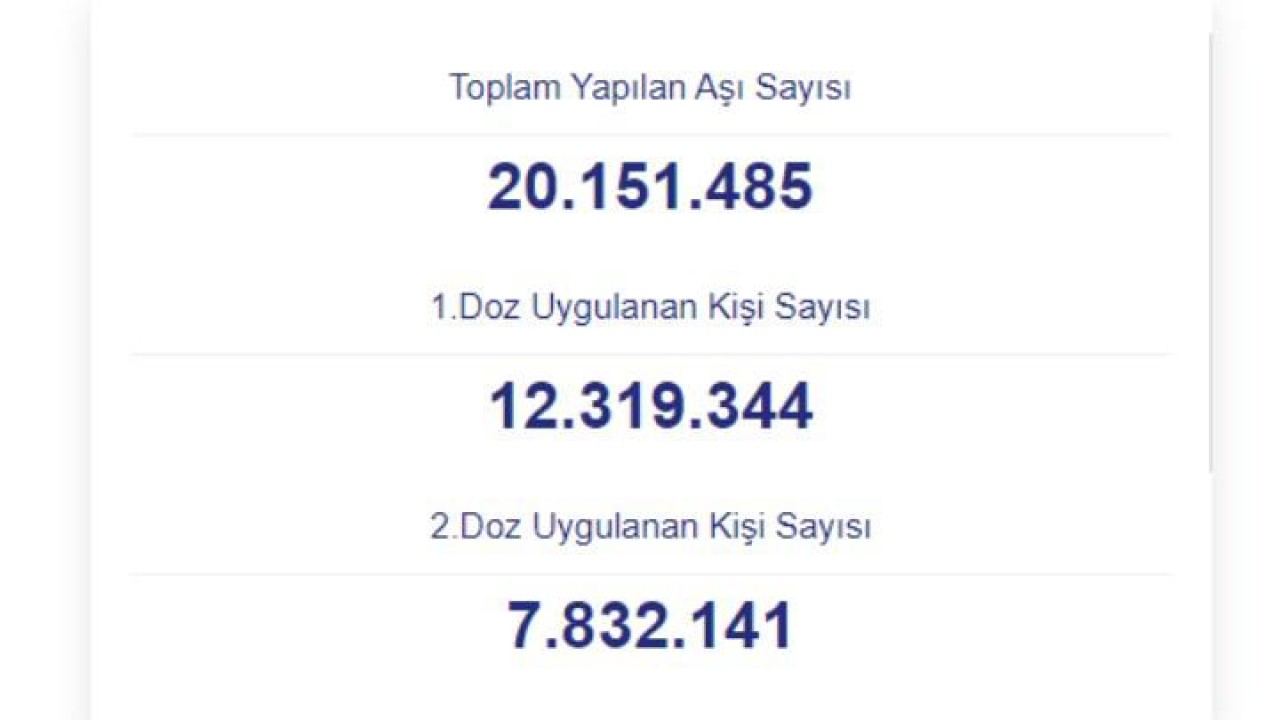Sağlık Bakanlığı’nın paylaştığı verilere göre aşılama çalışmalarında Türkiye, bir eşiği daha geride bıraktı. Bugüne kadar Türkiye’de 20 milyon 140 bin doz aşı yapıldı. Birinci dozu yapılan kişi sayısı 12, 3 milyonu geçerken, ikinci dozu yapılan kişi sayısı 7, 8 milyonu geçti.Bugün itibariyle 20 milyondan fazla doz aşı yaptık. Büyüklerimizi ve kronik hastalığı olan vatandaşlarımızı öncelikle korumaya almaya çalıştık. Aşı programımız tüm güçlüklere rağmen kararlılıkla sürecek. https://t.co/osI4yYriqp