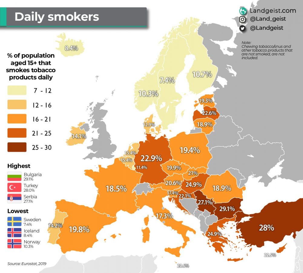 Landgeist'in Eurostat 2019 verilerini kullanarak hazırladığı grafik araştırma, 15 yaş üstündeki nüfusta günlük sigara içenlerin oranını gösteriyor. Araştırmada, Avrupa'nın en fazla sigara içen ülkeleri Güneydoğu Avrupa olarak göze çarpıyor. Bulgaristan %29, 1 oranla Avrupa'nın ilk sırasında yer alırken, Türkiye %28 oranla ikinci sırada yer alıyor. Üçüncü ise yine bir Doğu Avrupa ülkesi %27, 1 oranla Sırbistan.