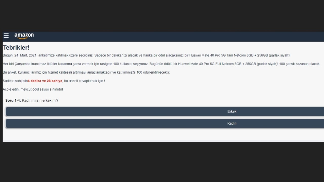 Dolandırıcıların son yöntemi dünyaca ünlü Amazon alışveriş sitesine benzer isimler kullanarak insanları kandırmak oldu.Sosyal medyada çokça dolaşan "amazaonz" isimli linkler insanların yanılmasına neden oluyor. Linklere tıklayanları anket doldurdukları taktirde akıllı telefon kazanacakları şeklinde bir sayfa karşılıyor. Aşağıda dolandırıcıların kullandığı yöntem olan sahte Amazon sayfasını görebilirsiniz.