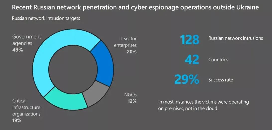 Ukrayna dışında 42 ülkeden 100'den fazla kuruluşun Rus hackerların saldırılarına maruz kaldığını tespit eden Microsoft, bu saldırıların %60'ından fazlasının NATO üyesi ülkelere karşı olduğunu açıkladı. Listenin ilk sırasında ise ABD var. Askeri ve insani yardımların dağıtım üssü olan Polonya da ciddi anlamda hackerların saldırısı altında. Son iki ay içerisinde Danimarka, Norveç, Finlandiya, İsveç ve Türkiye'de de siber saldırılar önemli ölçüde artmış durumda. Microsoft'un verilerine göre Rus hackerların saldırılarının %29'u başarılı olmuş. Bu saldırıların dörtte birinin ise veri sızıntısıyla sonuçlandığı belirtiliyor.