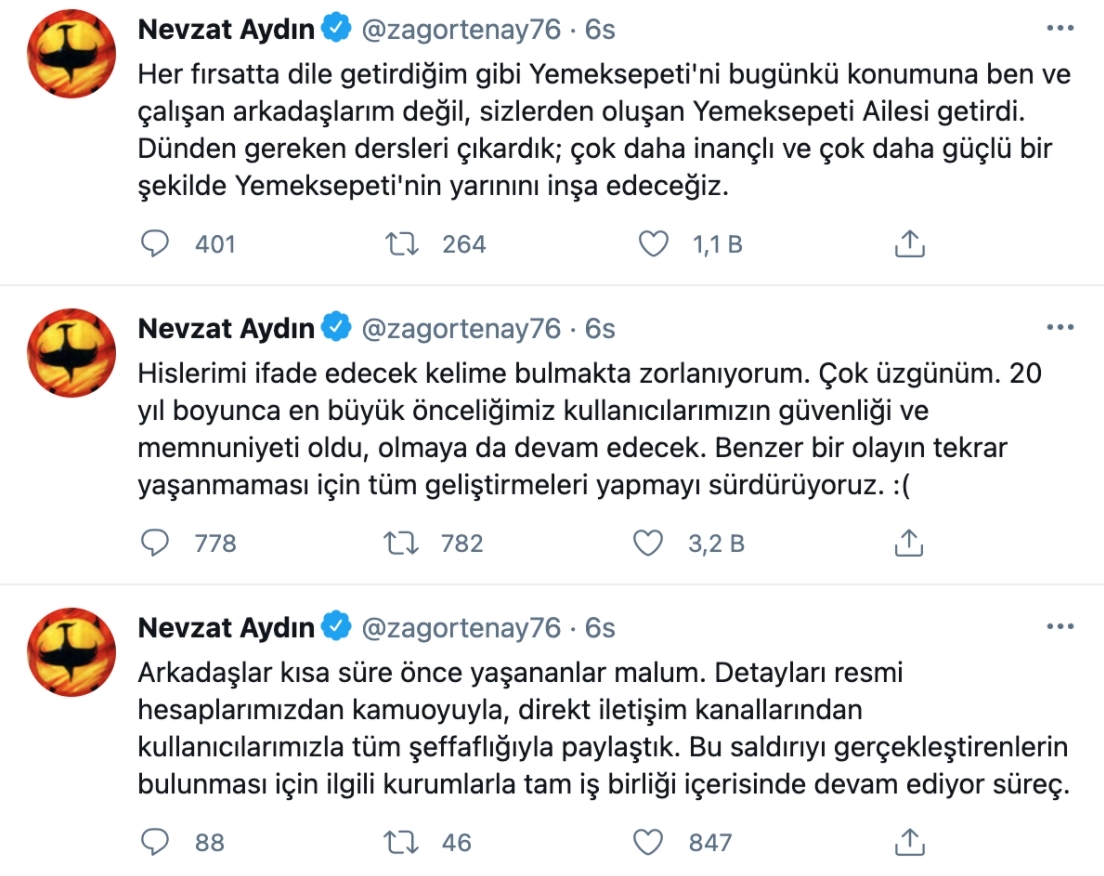 Yemeksepeti CEO’su Nevzat Aydın‘ın açıklaması şu şekilde;“Her fırsatta dile getirdiğim gibi Yemeksepeti’ni bugünkü konumuna ben ve çalışan arkadaşlarım değil, sizlerden oluşan Yemeksepeti Ailesi getirdi. Dünden gereken dersleri çıkardık; çok daha inançlı ve çok daha güçlü bir şekilde Yemeksepeti’nin yarınını inşa edeceğiz.”“Hislerimi ifade edecek kelime bulmakta zorlanıyorum. Çok üzgünüm. 20 yıl boyunca en büyük önceliğimiz kullanıcılarımızın güvenliği ve memnuniyeti oldu, olmaya da devam edecek. Benzer bir olayın tekrar yaşanmaması için tüm geliştirmeleri yapmayı sürdürüyoruz. :(“