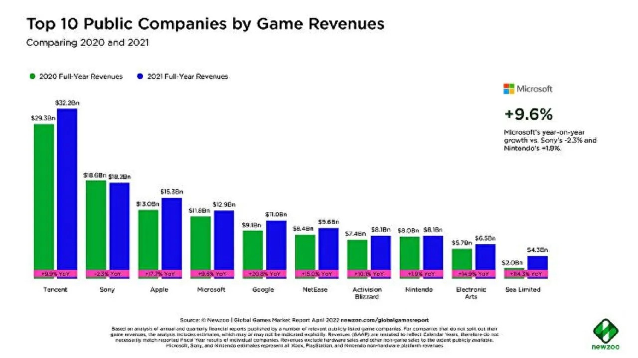 2021 yılının en çok para kazanan oyun şirketi Newzoo raporuna göre Tencent Games oldu. Mobil oyun sektöründe önemli bir yere sahip olan şirket, PUBG Mobile ve Call of Duty gibi yapımlarla geçtiğimiz sene 32, 2 milyar dolarlık gelir elde etti. 2020'de bu sayı 29, 3 milyar dolardı.Rapora göre ikinci sırada PlayStation markasıyla bilinen Sony yer alıyor. Sony, 2021 yılında 18, 3 milyar dolar kazandı. Sony'nin ardından gelen isim ise 15, 3 milyar dolar ile Apple oldu. Dördüncü sırada 12, 9 milyar dolar ile Microsoft yer alıyor.Oyun alanında en çok gelir elde eden şirketler sıralamasında 5. sıra Google'ın. 2021 yılında Google, 11 milyar dolar kazandı. Google'ı 6.'lık ile takip eden şirket ise 9, 6 milyar dolarla NetEase yer alıyor. NetEase'in ardından 8, 1 milyar dolar ile Blizzard geliyor. Sekizinci sırada 8, 1 milyar dolar ile Nintendo ve dokuzuncu sırada 6, 5 milyar dolar ile EA yer alıyor.Değerli düşüncelerinizi biz Megabayt ekibiyle yorumlarda paylaşabilirsiniz.