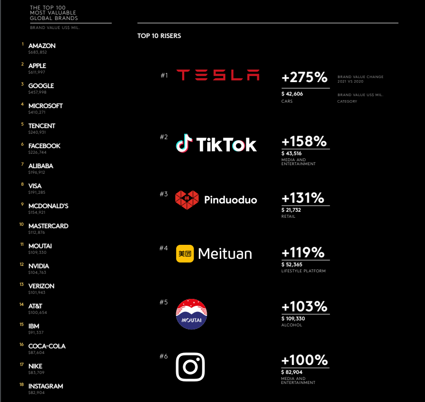 Spotify, 19 milyar dolar değeriyle 99. sırada yer aldı. En çok büyüyen marka sıralamasında ise Tesla, 1. oldu. Elon Musk'ın şirketi, geçen yıla göre %275 büyüdü. Sosyal medya uygulaması Tiktok, %158 büyüme ile Tesla'nın ardından 2. sıradaki yerini aldı. Siz yayınlanan bu rapor ile ilgili ne düşünüyorsunuz? Görüşlerinizi