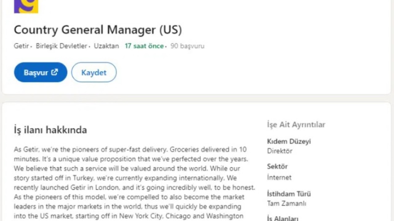 ABD Ülke Müdürü pozisyonu için iş ilanı yayınladı. Bu bağlamda ABD'de hizmet vereceği kesinleşti.