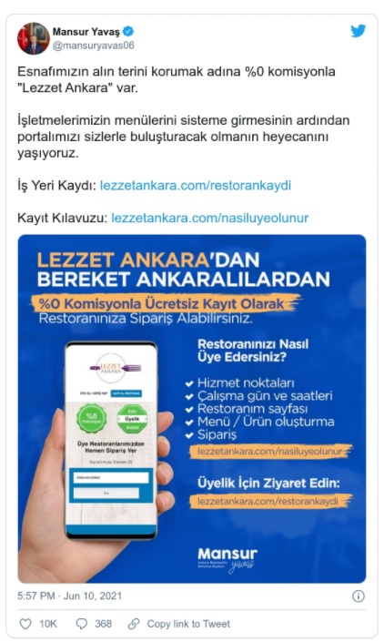 Mansur Yavaş, geçtiğimiz gün salgın nedeniyle gelir kaybına uğrayan Ankara esnafına destek amacıyla %0 komisyonla sipariş kabul edecek