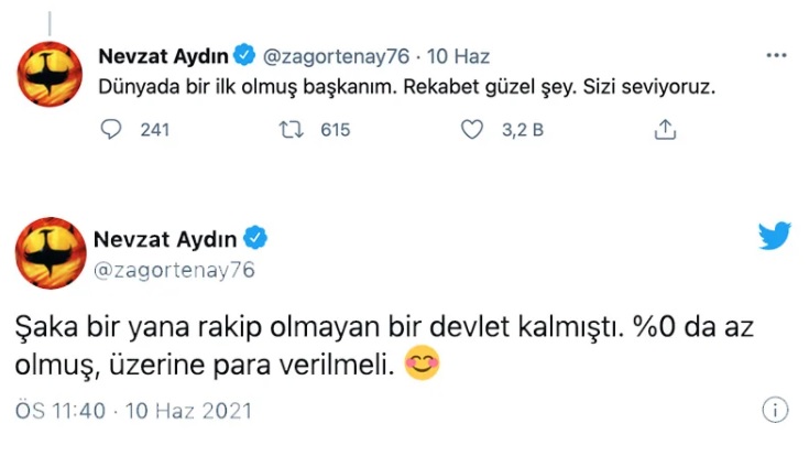 "Dünyada bir ilk olmuş başkanım. Rekabet güzel şey. Sizi seviyoruz" şeklinde yorum yapan Nevzat Aydın, attığı ikinci tweette ise projeyi hedef aldı. Aydın,