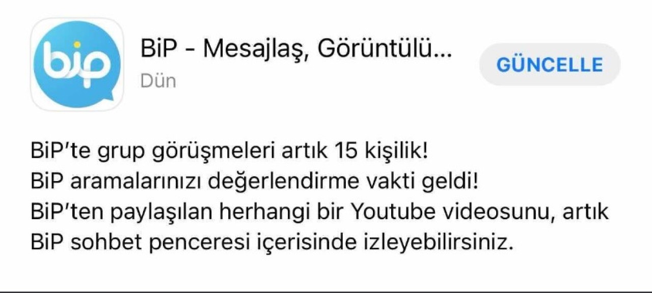 Grup görüşme özelliğini kullanıcılara sunan BiP, yeni güncelleme ile bu 6 kişi sınırını 15 kişiye çıkardı. Ayrıca kullanıcılara BiP aramalarını değerlendirme imkanı tanıyan uygulama, görüşme kalitesini artırmak için çalışmalara devam ediyor.