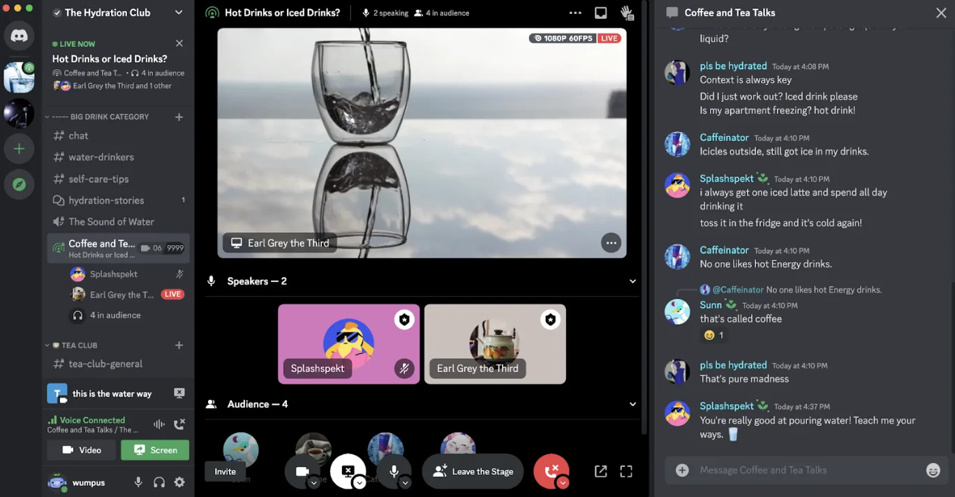 Bu arada metin sohbeti, sesli kanallardakiyle aynıdır. Panelin sağ üst kısmındaki "Sohbeti Göster"i seçip soru sorabilir veya konuşmacıların tartıştıkları hakkında yorum yapabilirsiniz. Ek olarak, moderatörler yalnızca belirli rollere sahip kullanıcıların bir sunucuda video veya ekranlarını paylaşmalarına izin verebilir.