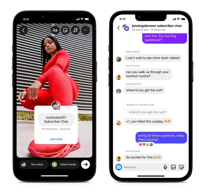 - Abone sohbetleri: Sadece içerik üreticisine abone olanların katılabileceği özel sohbetler. Messenger ile desteklenen abone sohbetleri doğrudan içerik üreticisinin gelen kutusundan veya hikayesinden oluşturulabilir ve 24 saat sonra otomatik olarak sonlandırılabilir. Böylece içerik üreticiler dengeyi kurabilir ve abonelerle ne zaman ve nasıl etkileşim kuracaklarına karar verebilir. Abone sohbetleri 30 kişiye kadar desteklenir, böylece içerik üreticileri abonelerle bağlantı kurabilir ve onları bir araya toplayabilir.