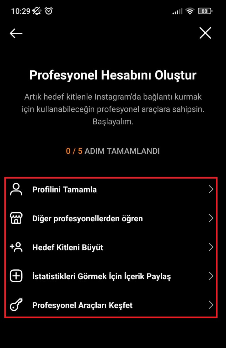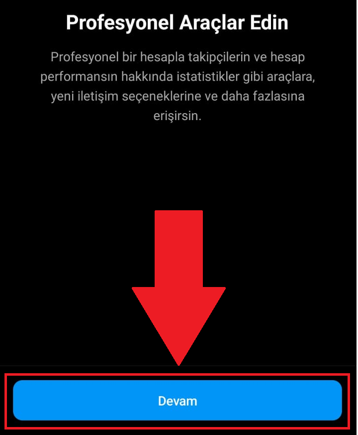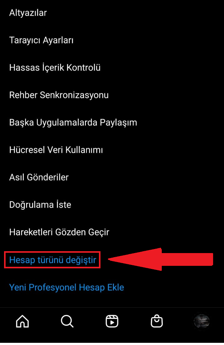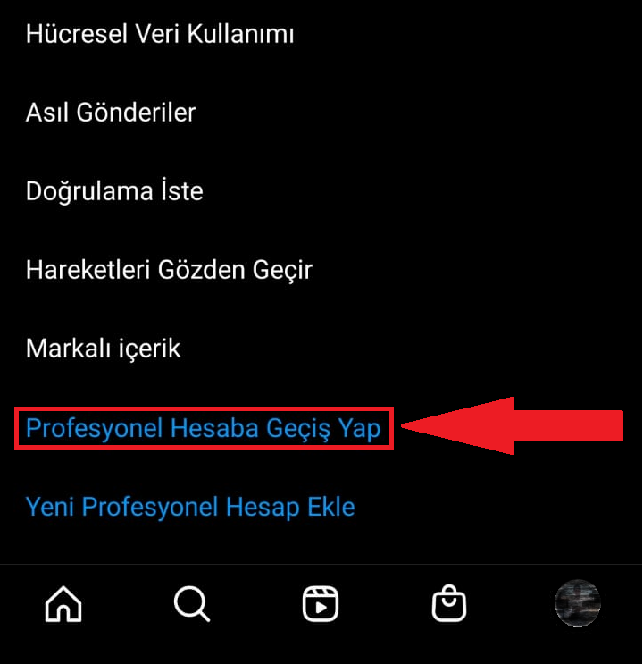 - Karşınıza gelen sayfayı en aşağı kaydırın ve “Profesyonel Hesaba Geçiş Yap” seçeneğine dokunun.