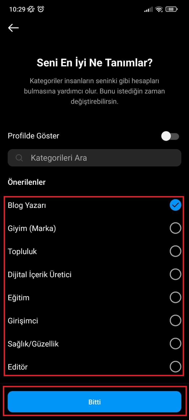 - Sizi en iyi tanımlayacak kategoriyi seçin ve “Bitti”ye dokunun. (30 saniye içinde hesabınızın geçiş işlemi gerçekleşecektir.)