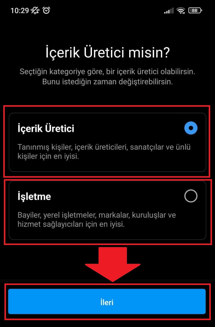 - İçerik Üreticisi veya İşletme hesabı seçeneklerinden kendinize uygun olanı seçin ve “İleri”ye dokunun.