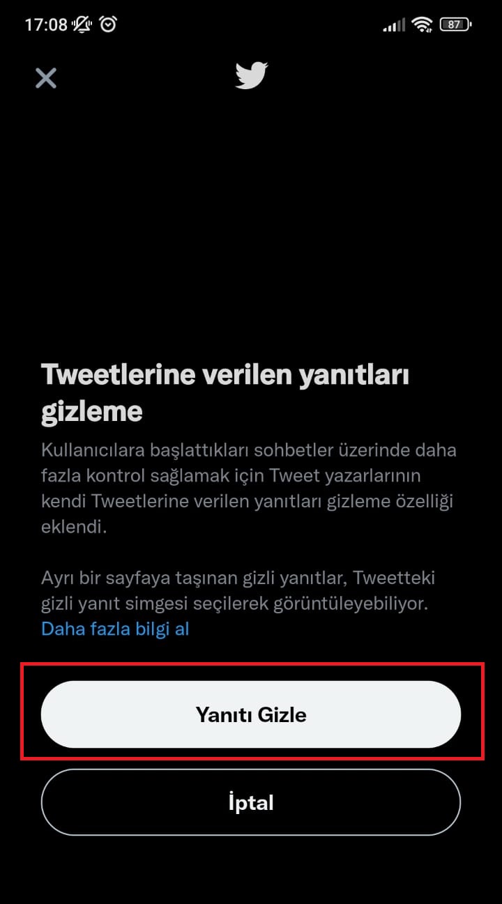 - Karşınıza gelen sayfada yazan bilgileri okuyun ve “Yanıtı Gizle” seçeneğine dokunun.