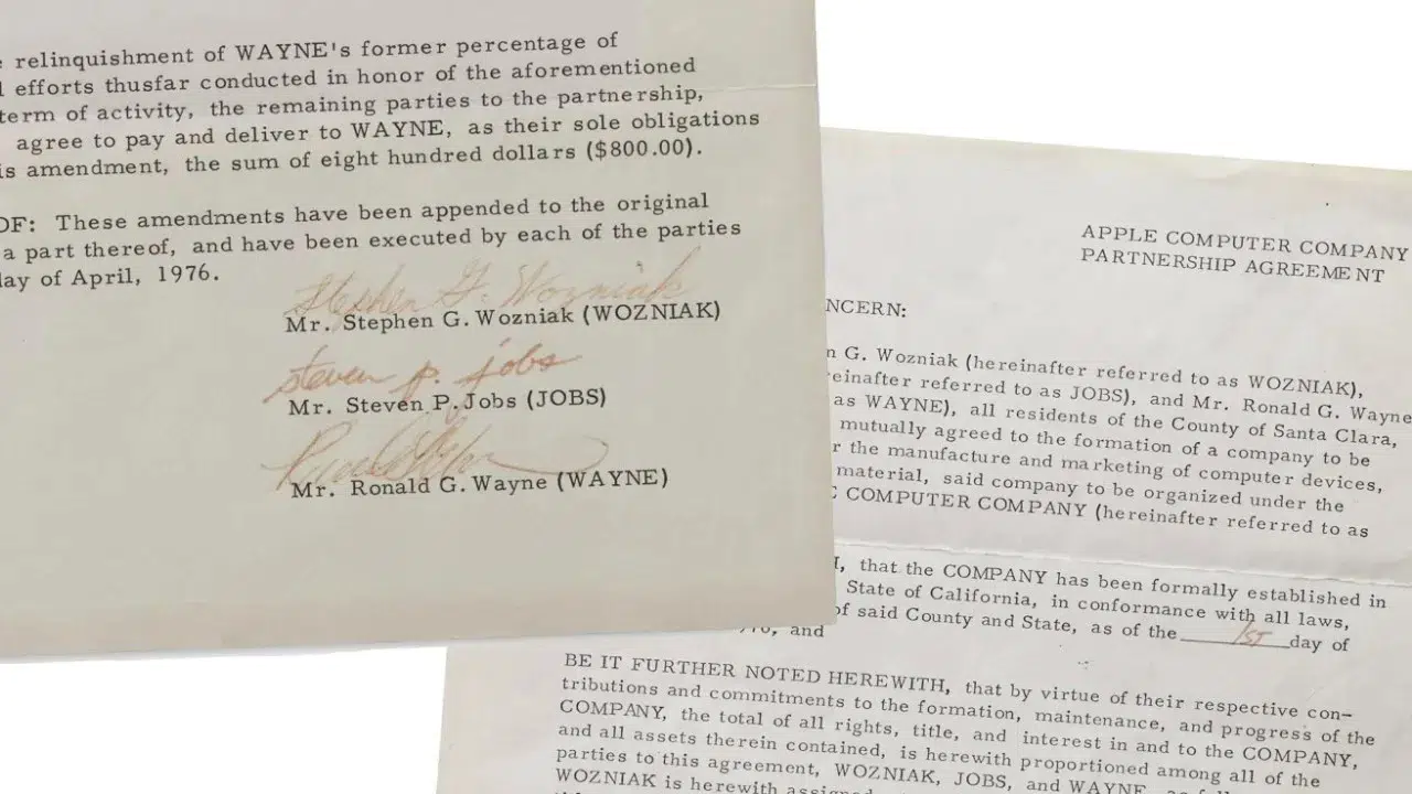 Sözleşme, Apple’ın kurucu ortakları olan Jobs, Wozniak ve Wayne’in imzalarını taşıyor ve şirketin ilk hisse dağılımını ayrıntılı bir şekilde açıklıyor. Ancak bu belgenin tarihsel önemini artıran bir diğer unsur ise Ron Wayne’in sadece 12 gün sonra şirketten ayrılmasıdır. Wayne, yüzde 10 hissesini Jobs ve Wozniak’a devrederek Apple’dan çekilmiş ve bu karar, teknoloji dünyasında "en büyük fırsat kayıplarından biri" olarak nitelendirilmiştir. Yine de Wayne, yıllar boyunca yaptığı röportajlarda bu karardan pişman olmadığını ifade etmiştir.