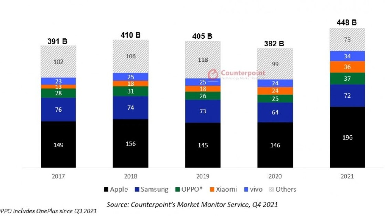 Apple, 196 milyar dolarlık toplam geliri ve akıllı telefon pazarındaki tüm gelirlerin %44'lük payına sahip olarak zirvede yer aldı. iPhone 13 serisine artan talebin yanı sıra önceki nesil iPhone 12 modellerine olan ilginin de arttığı görüldü. 2021'de iPhone'lar için ASP( Ortalama akıllı telefon satış fiyatı), tüm zamanların en yüksek seviyesi olan 821 dolara ulaştı. Apple, Hindistan, Tayland, Vietnam ve Brezilya gibi gelişmekte olan pazarlarda yükselişini sürdürdü.