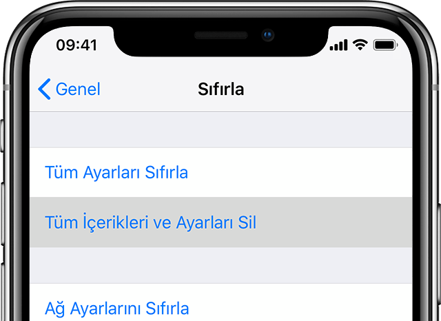 - En aşağıya inin ve "Sıfırla" seçeneğine girin. Ardından da "Tüm içerikleri ve ayarları sil" butonuna basın