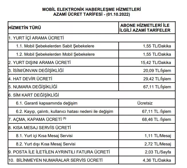 Operatörler, BTK’nın belirlediği fiyatların üzerine çıkamıyor ve BTK her sene 1 Nisan ve 1 Ekim tarihlerinde bu ücret tarifesini güncelliyor. 1 Ekim’den itibaren yürürlüğe giren, tarifeye 1 Ekim 2021’ kıyasla %77 oranında zam gelmiş oldu.