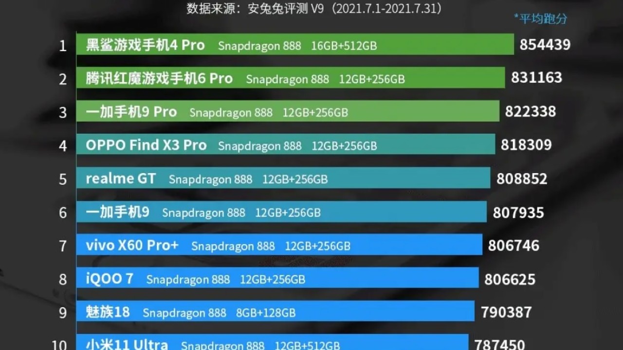 OnePlus 9 Pro ise 822.338 puanla üçüncü sırada yer aldı.Zirve yarışında ilk üç telefon benzer sonuçlar elde etmiş olsa da hepsinin Snapdragon 888 işlemcilerle donatıldığı göz ardı edilemez. Qualcomm'un bu yıl amiral gemisi modeli için geliştirdiği Snapdragon 888 yonga seti, Temmuz 2021'de gücünü bir kez daha gösterecek. Çünkü ilk 10 modelin tamamı Snapdragon 888 işlemci ile donatılmış ve çok iyi sonuçlar elde etmiş durumda.Listeye giren tüm modeller ve puanlar sırasıyla şu şekilde: