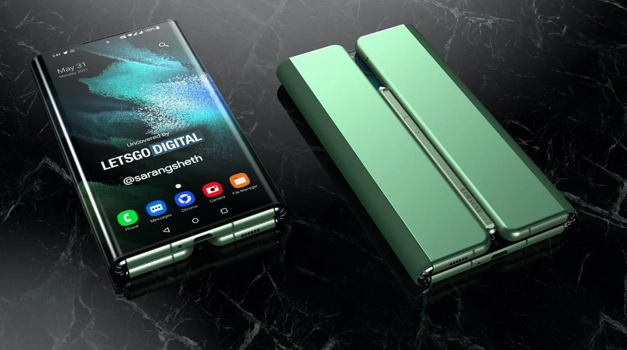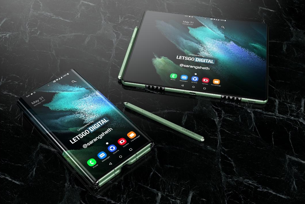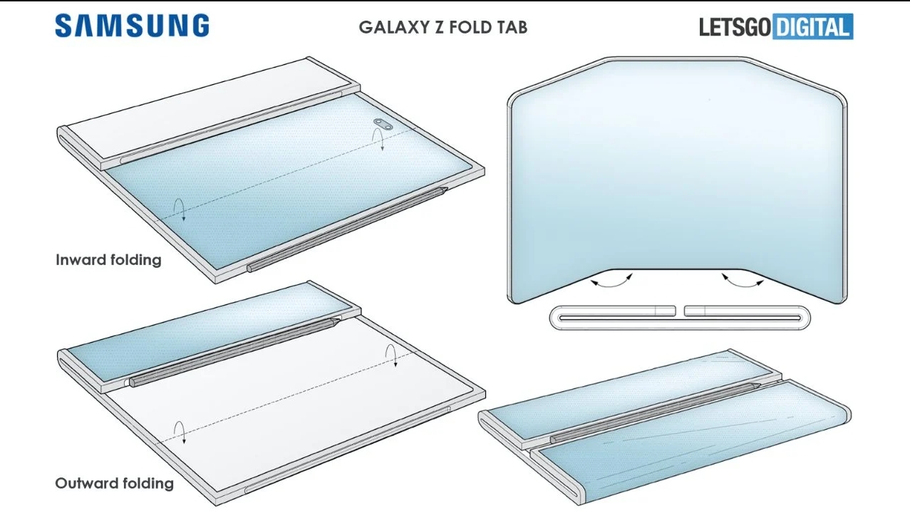 LetsGo Digital, tarafından ortaya çıkarılan ve Nisan 2021 tarihli olduğu belirtilen patent görselleri, Samsung'un tek bir menteşe üzerinden ikiye katlanabilen form faktörüne ek olarak iki farklı menteşeden iki yandan katlanabilen yeni bir katlanabilir akıllı telefon formu üzerinde çalıştığını gösteriyor.