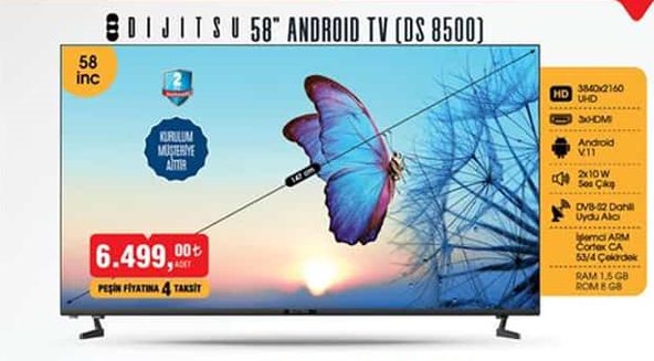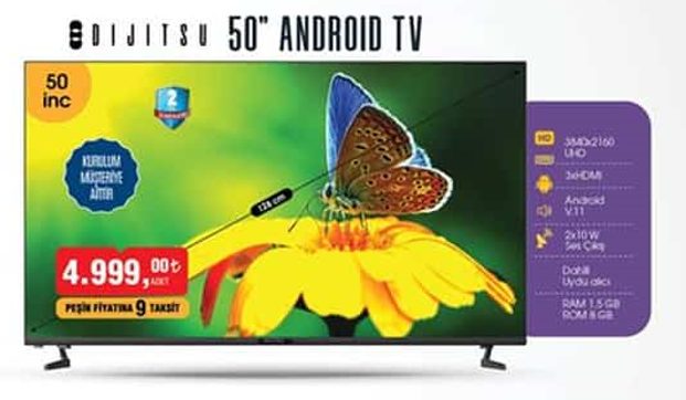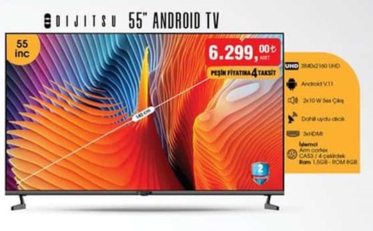 Özellikleri3840x2160 UHD 4K3x HDMI2x USBDahili uydu alıcılıDijital ses çıkışıFiyatı: 5199 TL Dijitsu 50” Android Tv