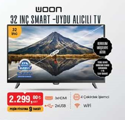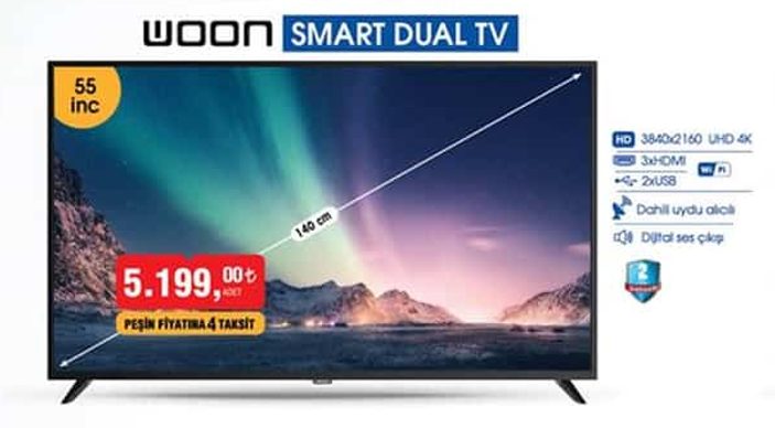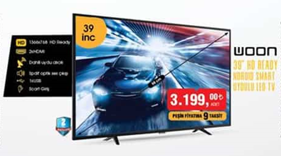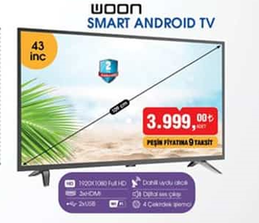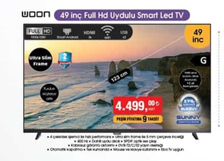 Özellikleri3840x 2160 UHD3x HDMIAndroid V.112x10 W ses çıkışDahili uydu alıcıRAM 1, 5 GBROM 8 GBFiyatı: 4999 TL Woon 49" Full Hd Uydulu Smart Led TV