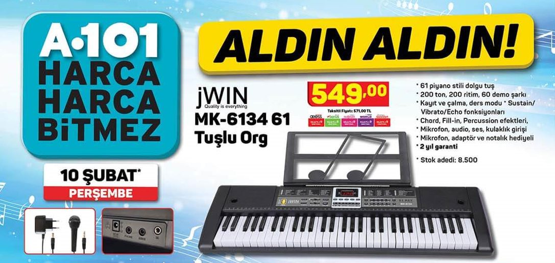 A101 Aktüel teknoloji ürünleri bu hafta da yenileniyor. 10 Şubat Perşembe A101 Aktüel teknoloji ürünlerine baktığımızda en çok dikkat çekenler JWIN MK-6134 61 tuşlu org ve Samsung Mikrodalga fırın olarak göze çarpıyor. Peki 10 Şubat Perşembe A101 teknoloji ürünleri neler? Özellikler ne? Fiyatları ne kadar? İşte tüm detaylar...