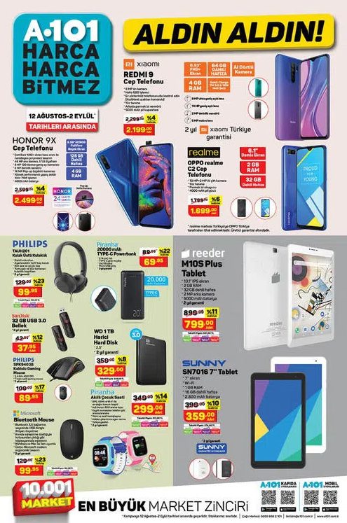 Zincir marketlerden A101'e 12 Ağustos - 2 Eylül tarihleri arasında gelecek olan teknolojik ürünler açıklandı. A101 12 Ağustos aktüel teknoloji ürünleri arasında akıllı telefonlardan akıllı süpürgelere kadar birçok ürün var.A101 bu hafta aktüel ürünleri arasında birçok teknolojik ürüne yer veriyor. Özellikler akıllı telefonlar Redmi 9, Honor 9X ve realme C2 telefonları ilgi çekiyor ve özellikleri merak ediliyor.