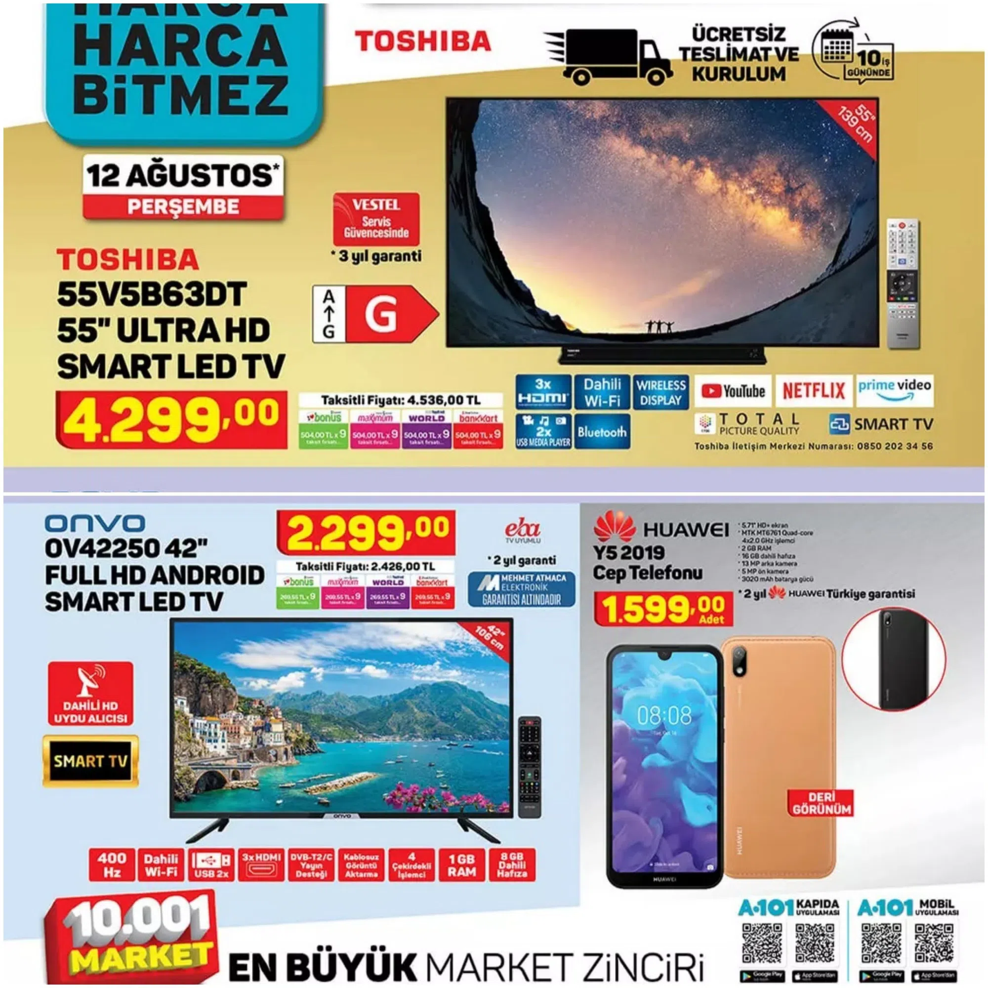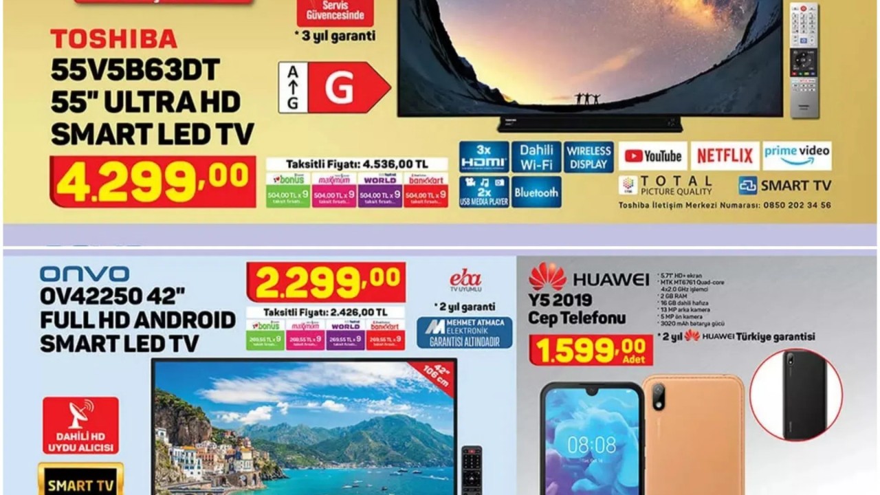 55 inçlik 4k çözünürlüklü Toshiba marka 55V5B63DT ULTRA HD SMAR LED TV 12 Ağustos'ta A101 marketlerde olacak. Fiyatı ise 4299 TL.n 5.71 inçlik HD ekran, 4 çekirdekli MediaTek işlemci, 2GB RAM, 16GB depolama, 13MP arka kamera, 3020mAh kapasiteli batarya gibi özellikleri olan Huawei Y5 2019 modeli 1599TL seviyesinde. satılacak.