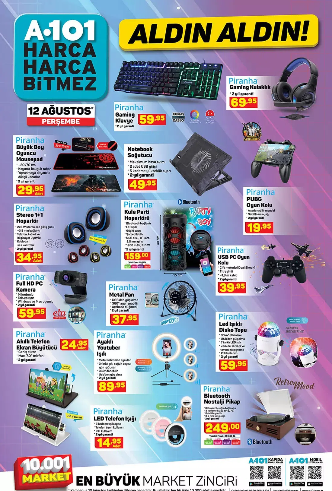 Piranha'nın uygun fiyatlı oyuncu ekipmanları da A101 marketlerde olacak.RGB aydınlatmalı Piranha oyuncu klavyesi 59.95TL iken, Piranha oyuncu kulaklığı 69.95TL, Piranha PUBG oyun kolu 19.95TL, dizüstü soğutucu 49.95TL, oyuncu fare matı 29.95TL, 2 adet 3W stereo hoparlör 29.95TL şeklinde fiyatlandırılmış.