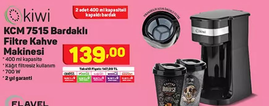Fiyatı: 139 TLÖzellikler- 400 ml kapasite- Kağıt filtresiz kuıllanım- 700 W- 2 yıl garanti