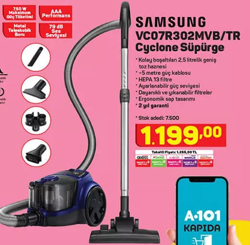 Fiyatı: 1.199 TLÖzellikleri- 750 W maks. güç tüketimi- AAA performans- Metal Teleskobik boru- 79 dB ses seviyesi- Kolay boşaltılan 2, 5 litrelik toz haznesi- 5 metre güç kablosu- HEPA 13 filtre- Ayarlanabilir güç seviyesi- Yıkanabilir filtreler- 2 yıl garanti