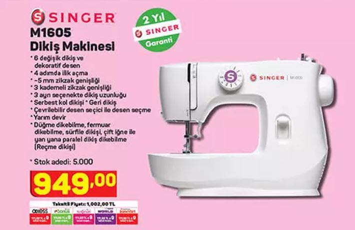 Fiyatı: 949 TLÖzellikleri- 6 farklı dikiş ve dekoratif desen- 4 adımda ilik açma- 5mm zikzak genişliği- 3 kademeli zikzak genişliği- 3 ayrı seçenekte dikiş uzunluğu- Serbest kol dikişi- Geri dikiş- Desen seçici- Yarım devir- Düğme dikebilme, fermuar dikebilme, sürfile dikişi, çift iğne ile yan yana paralel dikiş (Reçme dikişi)- 2 yıl garantiAşağıdan A101 13 Ocak Perşembe aktüel teknoloji ürün kataloglarının tamamını inceleyebilirsiniz.[gallery ids="38412, 38413, 38414, 38415, 38416"]