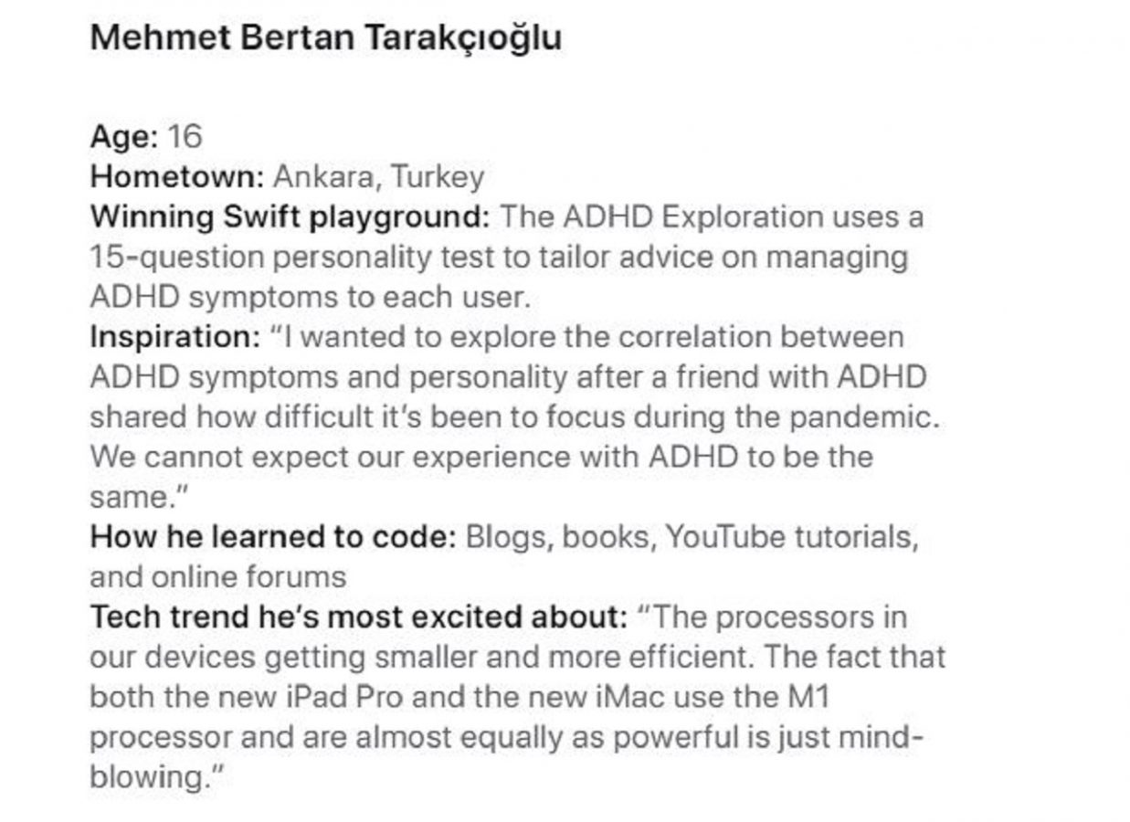 Swift Student Challenge Kazananları ile Tanışın” listesinde karşımıza çıkan Tarakçıoğlu, İngiltere, Hindistan, Rusya, ABD, Birleşik Arap Emirlikleri ve Brezilya’dan sayılı öğrenci ile Apple’ın resmi sitesinde yer almayı başardı.Yarışma kapsamında