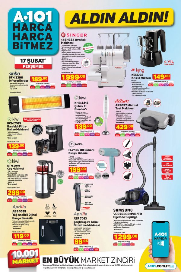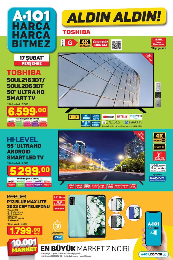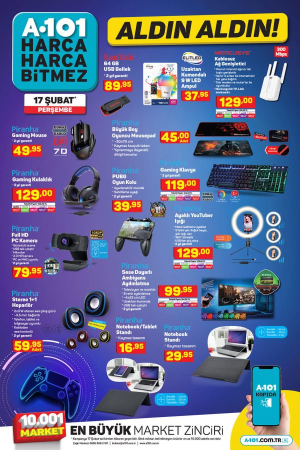 17 Şubat Perşembe günü A101 marketlere yine teknoloji ürünler geliyor. 17 Şubat A101 aktüel teknoloji ürünleri arasında oyuncular için Piranha Gaming ekipmanları var. Ayrıca Toshiba Televizyon, Reeder cep telefonu, Singer Overlok makinesi gibi birçok ürün tüketicinin beğenisine sunulacak.