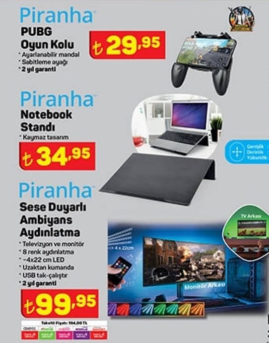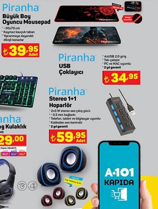A101 21 Nisan kataloğu açıklandı. Yine birçok teknoloji ürününün yer aldığı 21 Nisan Perşembe 101 aktüel kataloğunda, en çok dikkat çeken ürünler Piranha'nın oyuncu ekipmanları olacak gibi görünüyor. Uygun fiyatlı oyuncu ekipmanları satın almak isteyen oyuncular, A101'e gelecek Piranha oyuncu ekipmanlarını merak ediyor.İşte 21 Nisan A01 aktüel teknoloji ürünleri özellikleri ve fiyatları...A101 Piranha oyuncu ekipmanları: