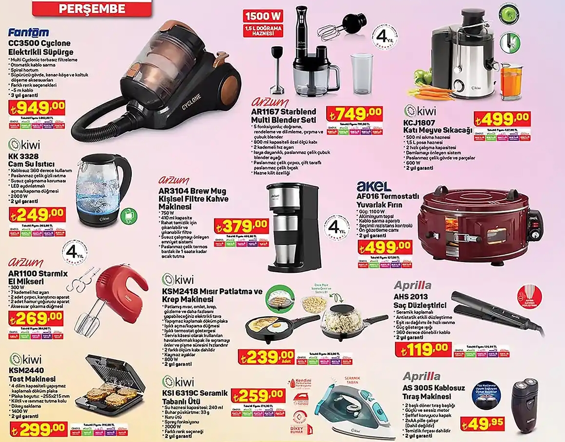 Dikkat çeken ürünler arasında Akıllı TV'ler, Reeder cep telefonu ve Singer dikiş makinesi gibi birçok ürün var.
