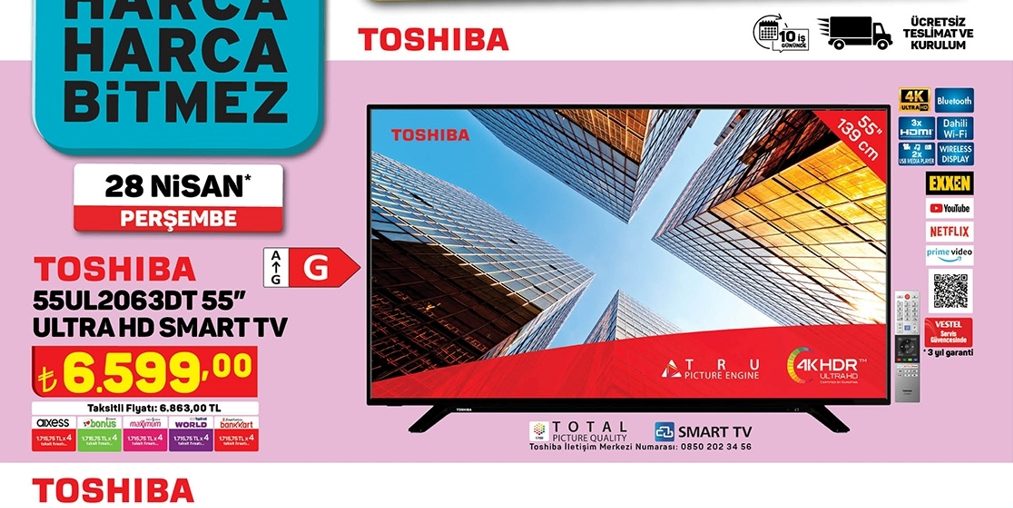 Fiyatı: 6.599 TLÖzellikleri- 55 inç 4K çözünürlük Ultra HD Smart TV