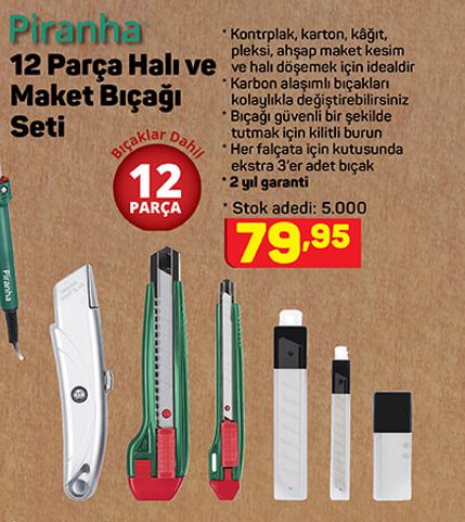 Piranha 12 Parça Halı ve Maket Bıçağı Seti: 79, 95 TL