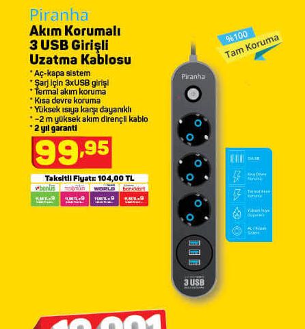 Piranha Akım korumalı 3 USB girişli uzatma kablosu