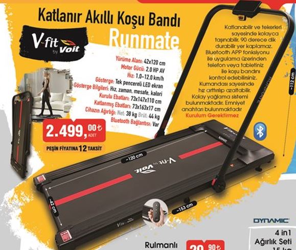 BİM'in 31 Aralık Aktüel ürünleri arasında en dikkat çeken ürünü şüphesiz ki, V-fit by Voit Runmate Katlanır Akıllı Koşu bandı. Katlanabilir ve tekerlekli yapısı sayesinde kolayca taşınabilir olan koşu bandı 90 derece dik durabilir ve yer kaplamaz. Bluetooth APP fonksiyonu sayesinde uygulama üzerinden koşu bandını telefonunuzdan kontrol edebilirsiniz. Kumandası sayesinde hız artırıp azaltılabilir ve kolay yağlama sistemi bulunmaktandır. Ayrıca emniyet anahtarı bulunmaktadır.Fiyat: 2.499 TLÖzellikler- Yürüme alanı: 42X120 CM
