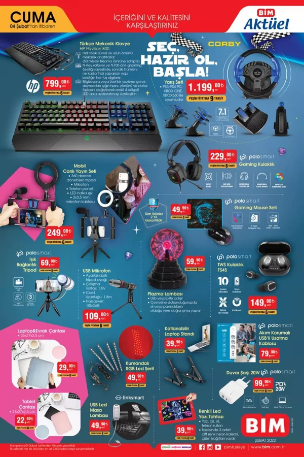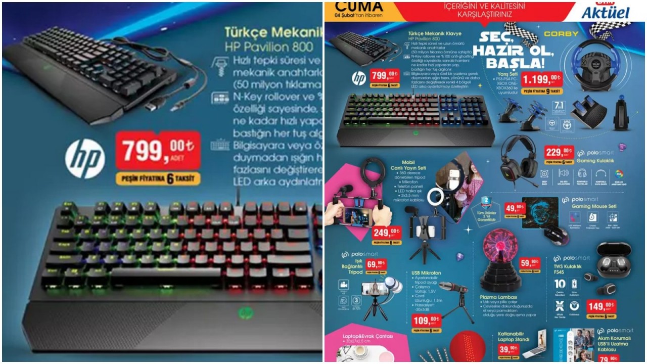 4 Şubat BİM Aktüel kataloğunda yine birçok teknolojik ürün yer alıyor. BİM zincir marketlerine gelecek olan teknolojik ürünleri sizler için listeledik. İşte 4 Şubat 2022 BİM Aktüel teknoloji ürünler...4 Şubat Cuma BİM Aktüel teknoloji ürünlerine baktığımız zaman en çok dikkat çeken ürün HP Pavilion 800 mekanik klavye. Bunun dışında PoloSmart'ın farklı kulaklık çözümleri ve Corby'nin direksiyon yarış seti de öne çıkanlar arasında.