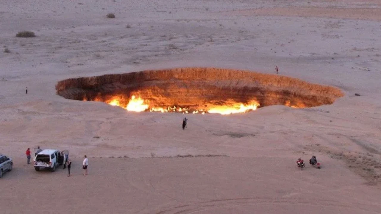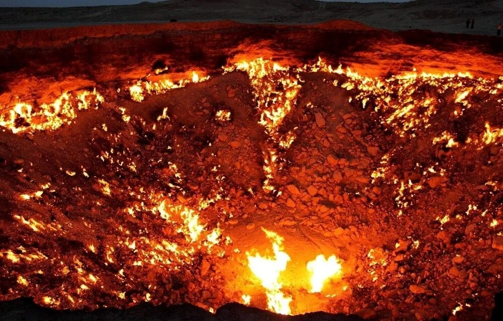 Sovyetler Birliği döneminde jeologların çalışması sırasında yanlışlıkla oluşa, , yaklaşık 60 metre çapında ve 20 metre derinliğindeki kraterdeki ateş 1971'den bu yana aktif durumda.Cehennem Kapısı diye de bilinen krater, turistlerin de ilgi odağı durumunda.