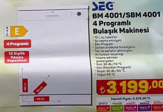 Fiyatı: 3.899 TLSEG 4 Programlı Bulaşık Makinesi