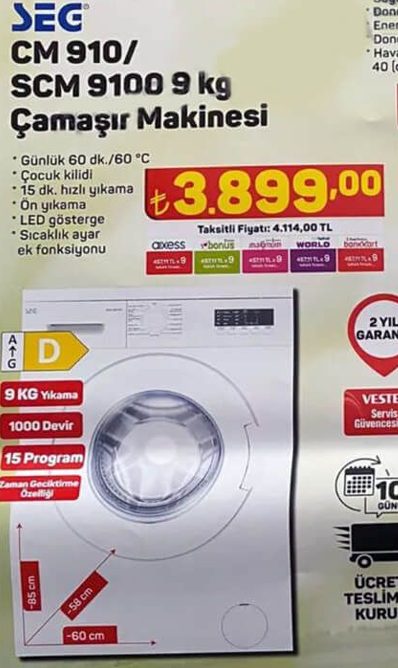Fiyatı: 3.599 TLSEG 9 kg Çamaşır Makinesi