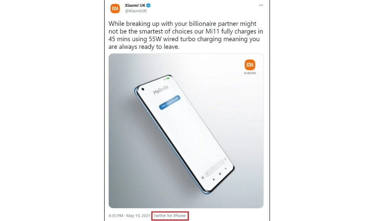 "Milyarder eşinizden ayrılmak en akıllıca seçenek olmayabilir ancak Mi 11'imiz 55W kablolu turbo şarjı kullanarak 45 dakikada tam şarj olur, yani ayrılmaya daima hazırsınız demektir" ifadelerine yer veriyor. Evet, ne yazık ki Xiaomi Birleşik Krallık bu tweetinde Mi11'in hızlı şarj özelliğini öne çıkarmak için Bill Gates ile eşi Melinda Gates'in almış olduğu boşanma kararına göndermede bulunuyor.Üstüne üstlük tweet yeterince kötü değilmiş gibi üstüne bir de hadsiz bir görsel eklenmiş. Söz konusu görselde Melinda adlı bir kişiden gelen mesajda