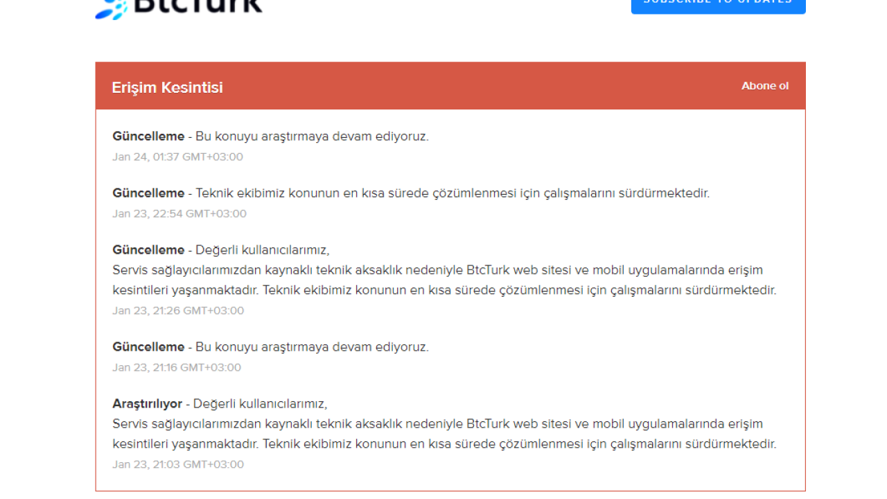 Değerli kullanıcılarımız, Teknik ekibimiz, #BtcTurk web sitesi ve mobil uygulamalarında yaşanan erişim kesintilerinin yaklaşık 2 saat içerisinde sona ereceğini öngörmektedir.Kullanıcılarımız hesaplarına öncelikle geçici olarak “Emir İptal” modunda ulaşabilecek ve tüm varlıklarını görüntüleyebileceklerdir. Sabrınız ve anlayışınız için teşekkür ederiz.