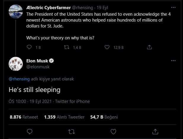 SpaceX ve Tesla'nın sahibi Elon Musk, sosyal medyada yine rahat durmuyor. Milyarder iş adamı, bu kez ABD Başkanı Joe Biden'a taş attı.Elon Musk'un uzay şirketi SpaceX, geçtiğimiz günlerde tarihin ilk tamamı sivil mürettebat ile uzay seyahatini gerçekleştirmiş ve 4 sivili 3 gün boyunca Dünya yörüngesinde bir geziye göndermişti. Inspiration4 olarak adlandırılan sivil uzay seyahati, bu alanda oldukça önemli bir gelişme olarak kayıtlara geçti. Ancak ABD Başkanı Joe Biden'ın çok ilgisini çekmemiş olacak ki, Elon Musk'a bir tebrik bile göndermiş değil. Bu durum milyarder iş adamını pek memnun etmemiş olacak ki, Musk, Twitter üzerinden Joe Biden'a bir taş attı.Twitter'da bir takipçisinin konuyu, "ABD başkanı, St. Jude için yüz milyonlarca dolar toplanmasını sağlayan 4 Amerikan astronotunu tebrik etmeyi bile reddetti. Nedenine dair teoriniz nedir?" şeklinde dile getirmesine ilişkin olarak Elon Musk, Biden'ı kast ederek "hala uyuyor" şeklinde cevap verdi.