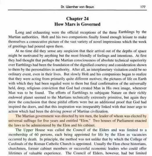"Kaderden bahsetmişken, bunu biliyor muydunuz? Von Braun, 1953 tarihli "Mars Projesi" adlı kitabında Mars'a insanları getirecek olan Elon adında bir kişiye atıfta bulunuyor mu? "Şeklinde yanıt verdi. Bu soruya rağmen
