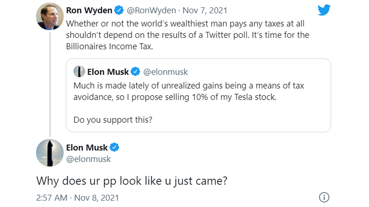 ABD’li senatör Ron Wylden, Elon Musk’ın gibi milyarderlerin gelir vergisi ödemesi gerektiğini söyledi.. Elon Musk ise bu yorumu çok umursamadan direkt olarak senatörün profil fotoğrafıyla dalga geçti.Wylden Elon Musk’ın anketini alıntılayarak şunları söyledi: “Dünyanın en zengin adamının herhangi bir vergi ödeyip ödemeyeceği, bir Twitter anketinin sonuçlarına bağlı olmamalı . Milyarderler için gelir vergisinin zamanı geldi” Elon Musk’ın cevabı ise şöyle oldu:“Neden profil fotoğrafında az önce boşalmışsın gibi duruyorsun”Elon Musk’ın bu hareketi kimileri tarafından tepki çekti.